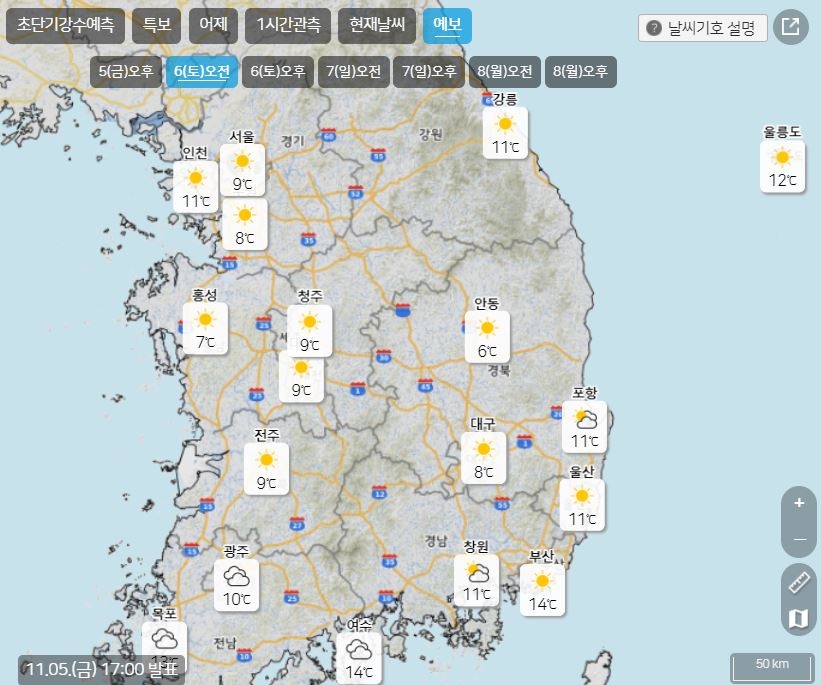 이미지 확대보기5일 기상청은 “6일 전국이 대체로 맑겠으나, 전남권과 경남권은 구름이 많고 제주도는 흐리겠다. 제주도는 남쪽 해상을 지나는 저기압의 영향으로 낮 3시까지 가끔 약한 비가 오는 곳도 있겠다. 전남 남해안에도 빗방울이 떨어지는 곳이 있을 전망이다”라고 내다봤다.