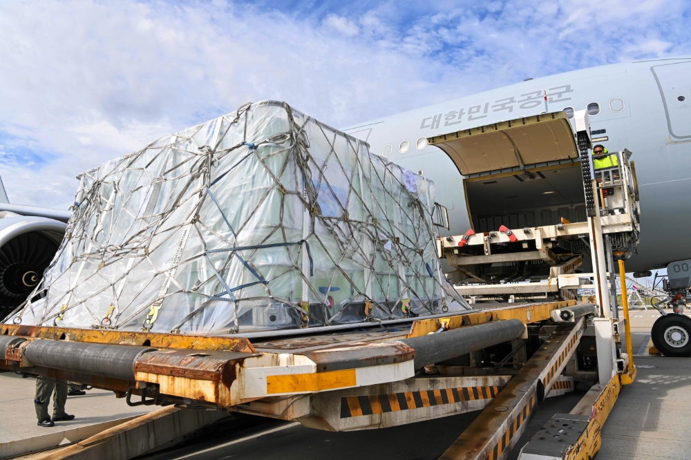 11일 오전(현지 시간) 호주 브리즈번 공항에서 관계자들이 호주에서 공수한 요소수를 공군 다목적 공증급유 수송기 KC-330에 탑재하고 있다. 사진=공군 제공 이미지 확대보기