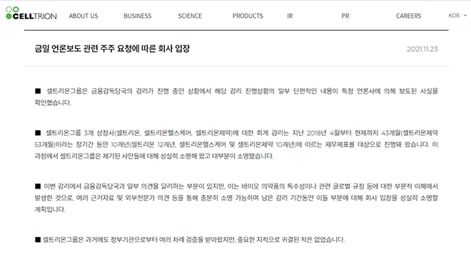 이미지 확대보기셀트리온은 지난 23일 홈페이지에 '분식회계 논란'에 대한 언론보도와 관련해 주주 요청에 따른 회사 입장을 공지했습니다.