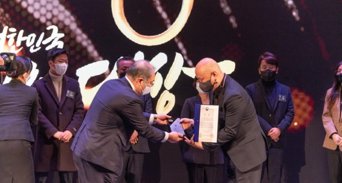 김탁훈 ㈜탁툰엔터프라이즈 대표가 2021 대한민국 콘텐츠 대상 애니메이션 부문에서 문화체육관광부 장관상을 수상하는 모습. 사진=중앙대 제공이미지 확대보기
