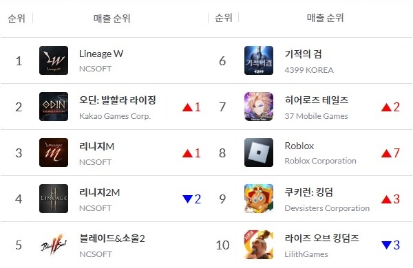 엔씨소프트(NC) '리니지W'가 구글 플레이스토어 매출 1위를 굳건히 사수하는 가운데 카카오게임즈 '오딘: 발할라 라이징'이 '리니지2M'을 밀어내고 다시 2위 자리를 탈환했다.