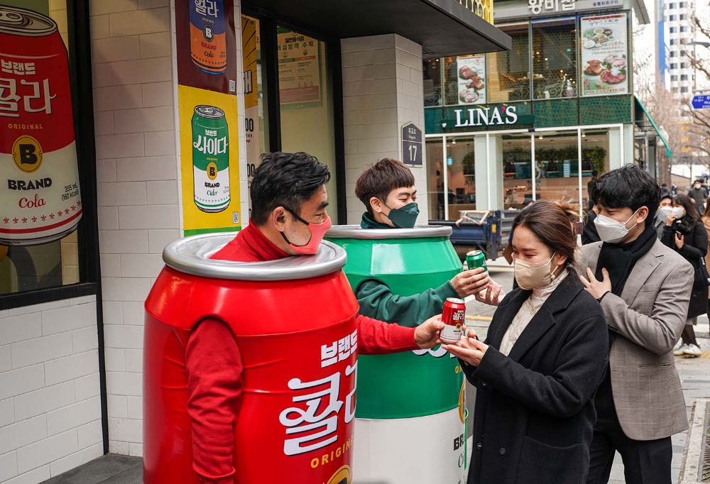 두 사람은 노브랜드 버거가 이날 내놓은 ‘브랜드 콜라’와 ‘브랜드 사이다’를 알리기 위해 홍보맨으로 변신해 제품들을 고객들에게 나눠줬다. 이들 제품은 전국 노브랜드 버거 매장에서 배달‧포장 구매 시 받을 수 있다.