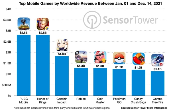 채플 연구원은 이어 "양대 마켓 매출만으로 '유니콘(창립 10년 안에 기업가치 1억 달러를 돌파한 비상장사)' 반열에 든 모바일 게임은 2019년에 3개, 2020년에 5개로 점정 증가하고 있다"며 "원신·캔디 크러시 사가·프리 파이어는 올해 새로이 목록에 오른 게임들"이라고 전했다.