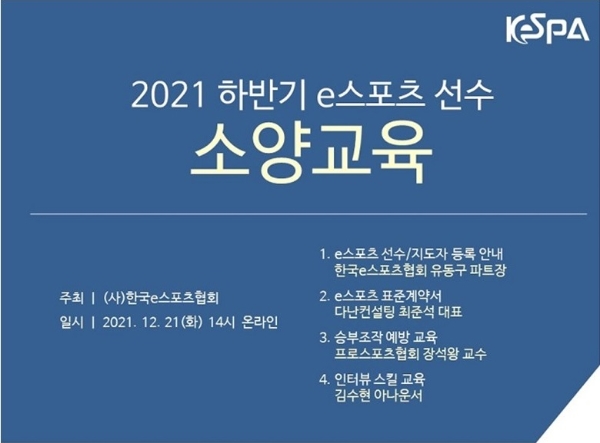 이미지 확대보기KeSPA 선정 공인 종목에 참여하는 100여 명의 선수들이 온라인으로 참여한 이번 소양교육에 유동구 KeSPA 파트장, 한국프로스포츠협회 전문 강사인 장석왕 한국체육대학 교수 등 업계 전문가들이 초빙됐다.