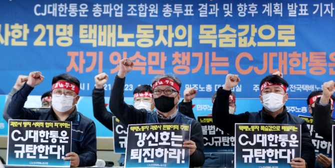 이미지 확대보기전국택배노동조합 CJ대한통운본부는 23일 오후 서울 중구 민주노총 대회의실에서 열린 총파업 찬반투표 결과 조합원의 93.6%가 압도적으로 찬성해 가결됐다고 밝혔다. 이에 CJ대한통운 조합원 1700명은 오는 28일부터 총파업에 나선다.