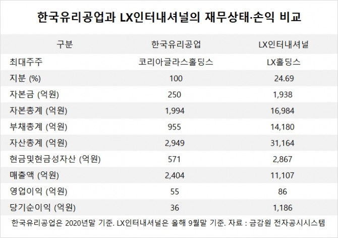 한국유리공업의 인수에 나서는 LX인터내셔널은 올해 9월말 기준 자본금 1938억원, 자본총계 1조6984억원, 부채총계 1조4180억원, 자산총계 3조1164억원 규모입니다. LX인터내셔널은 현금및현금성자산으로 2867억원을 갖고 있습니다.