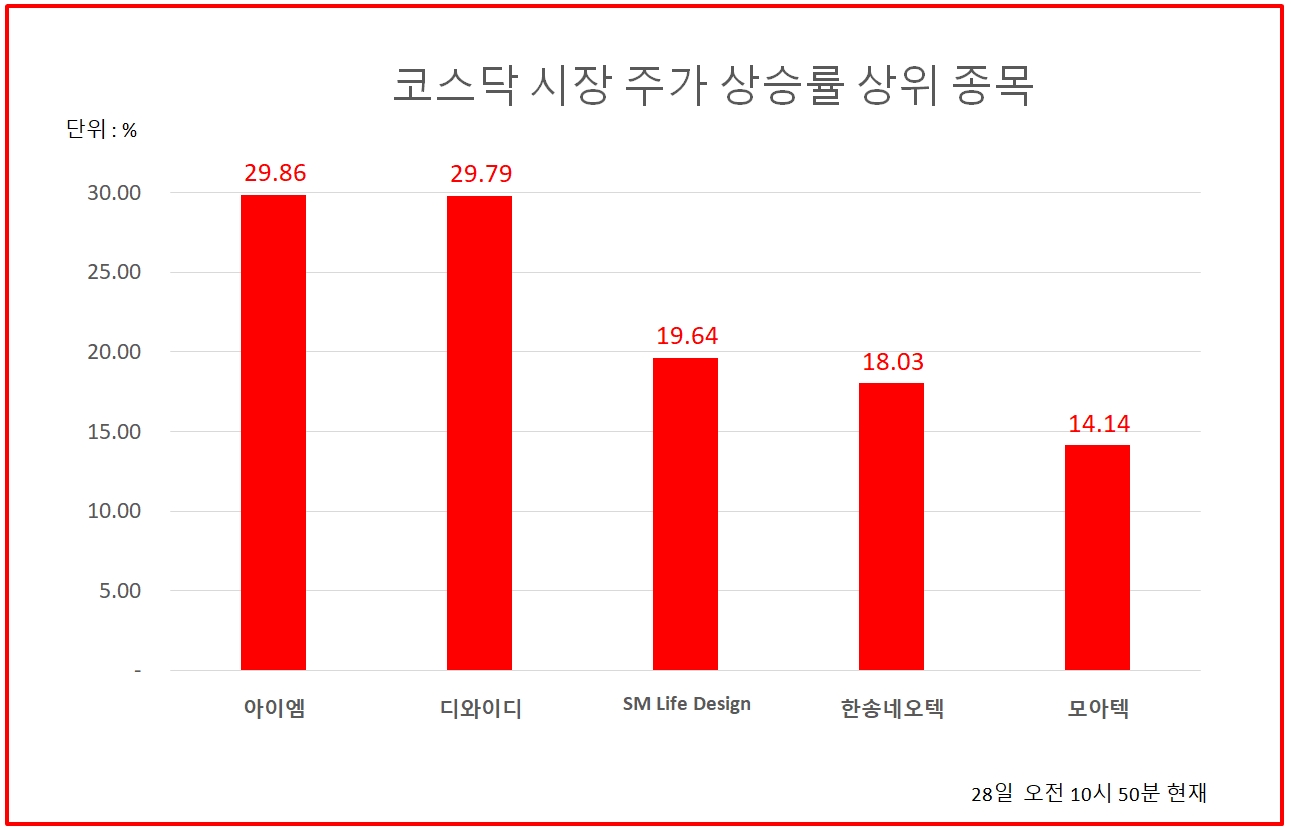 이미지 확대보기28일 한국거래소에 따르면 아이엠은 이날 오전 10시 50분 현재 기준가 대비 29.86% 급등세를 나타냈다.
