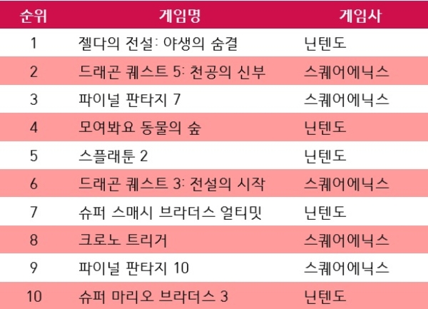 1위 '젤다 야숨', 2위 '드래곤 퀘스트' 등 톱10 '양강 구도'