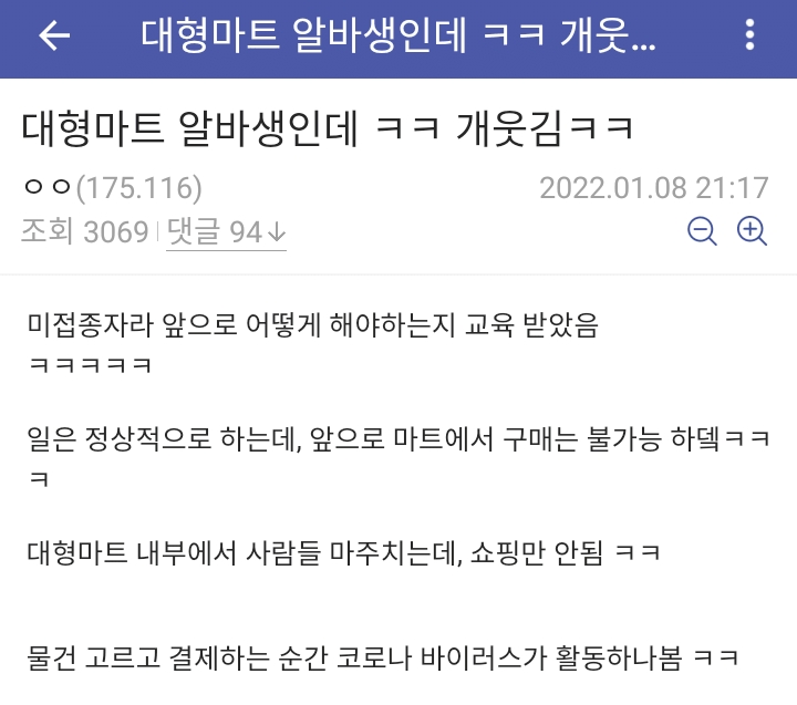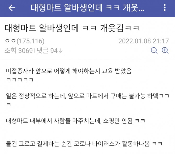 이 게시물을 작성한 글쓴이는 본인을 대형마트 아르바이트생이라고 밝히고 “미접종자라 앞으로 어떻게 해야하는지 교육 받았다”며 “일은 정상적으로 하는데 앞으로 마트에서 구매는 불가능하다”고 했다.