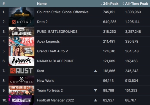 밸브 자사 게임 '카운터 스트라이크: 글로벌 오펜시브'와 '도타 2'가 투 톱을 유지하는 가운데 크래프톤 '펍지: 배틀그라운드', EA '에이펙스 레전드', 넷이즈 '나라카: 블레이드 포인트' 등 배틀로얄 슈팅 게임들이 꾸준한 강세를 보이고 있다.