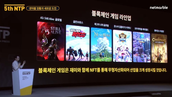 이미지 확대보기방준혁 의장은 이날 "넷마블은 그동안 '글로벌 파이오니어(Global Pioneer)'로 자리잡기 위해 노력했다"며 향후 도전의 핵심은 블록체인으로, 제2의 나라·몬스터 길들이기·A3 등 핵심 IP들을 P2E(Play to Earn) 게임으로 개발하고 관련 NFT(대체불가능토큰)을 내놓을 예정"이라고 발표했다.