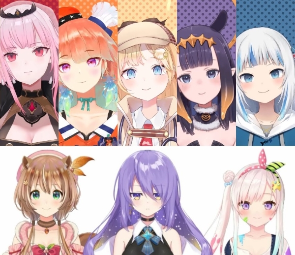 홀로라이브 영어권 1기 홀로미스(위)와 인도네시아 1기 멤버들. 왼쪽 위부터 시계방향으로 모리 칼리오페·타카나시 키아라·왓슨 아멜리아·니노마에 이나니스·가우르 구라·아이라니 이오피프틴·무나 호시노바·아윤다 리스. 사진=홀로라이브 유튜브