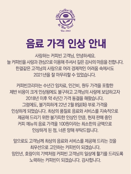 회사 측은 공지에 “최상의 품질로 음료와 서비스를 지속적으로 제공하기 위해 불가피하게 최소한의 폭으로 가격을 올렸다"며 "소비자들의 양해를 부탁드린다”고 말했다.