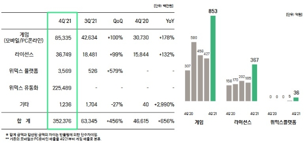 위메이드는 지난해 4분기 연결 기준 실적 잠정치가 매출 3524억원, 영업이익 2540억원, 당기순이익 4250억원으로 2020년 4분기에 비해 흑자전환, 전분기 대비 매출 456%, 영업이익 1358%, 당기순이익 2277%가 상승했다고 발표했다.