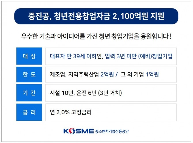 중진공, 청년 창업기업에 정책자금 2100억원 지원