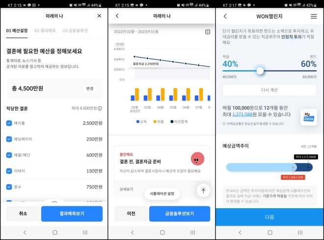막연한 상상을 구체화 시켜준다는 점이 우리마이데터의 핵심이다. 필자의 경우 1년 후 결혼하는 30대 남성으로 설정하고 여유 자금을 2000만원으로 설정 후 시뮬레이션 해봤다. ‘미래의 나’는 예식홀, 패키지, 예물·예단 등의 평균 값으로 4500만원이 도출됐다. ‘미래의 나’는 필자의 월 소득이나 소비 습관 등을 분석해 1년 뒤 결혼식을 치르기 위해선 지금보다 월 10만원을 추가로 적립해야한다고 진단했다. 특히 현금성 자산이 부족해 결혼 시점에 예산 조정과 함께 추가 소득이 필요하다는 점도 지적했다.