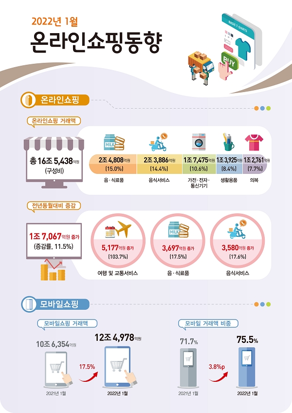 이미지 확대보기3일 통계청이 발표한 ‘2022년 1월 온라인쇼핑 동향’에 따르면 1월 온라인쇼핑 거래액은 16조5438억원으로 전년 동월 대비 11.5% 증가했다. 전월 대비 온라인쇼핑 거래액은 7.1% 감소했다.