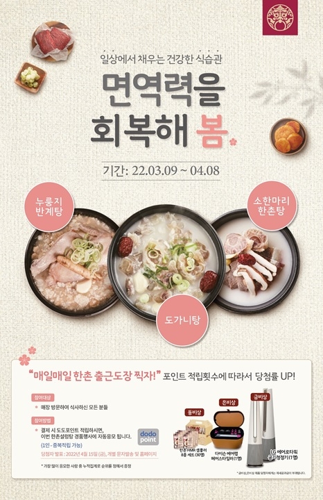 한촌설렁탕 관계자는 “활기찬 봄처럼 우리의 몸도 건강하게 챙기고 끝나지 않고 있는 코로나19도 하루 빨리 극복해보자는 의미에서 봄 시즌 보양 메뉴 할인 이벤트와 경품 행사를 기획하게 됐다”며 “특히 이번에는 포인트를 적립한 고객에게 특별한 사은품도 제공하는 만큼 많은 참여를 바란다”고 말했다.
