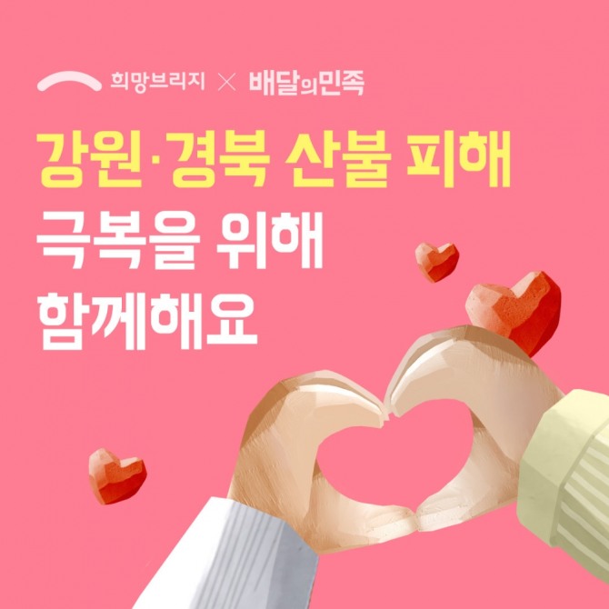 우아한형제들은 희망브리지 전국재해구호협회와 손잡고 산불피해 복구 및 이재민을 돕기 위한 모금 캠페인도 전개한다. 오는 9일부터 배민 앱에 ‘힘내세요’ 버튼을 마련하고 이용자가 이를 클릭하면 클릭 수 당 1000원씩 더해 배민이 총액을 기부하는 방식이다.