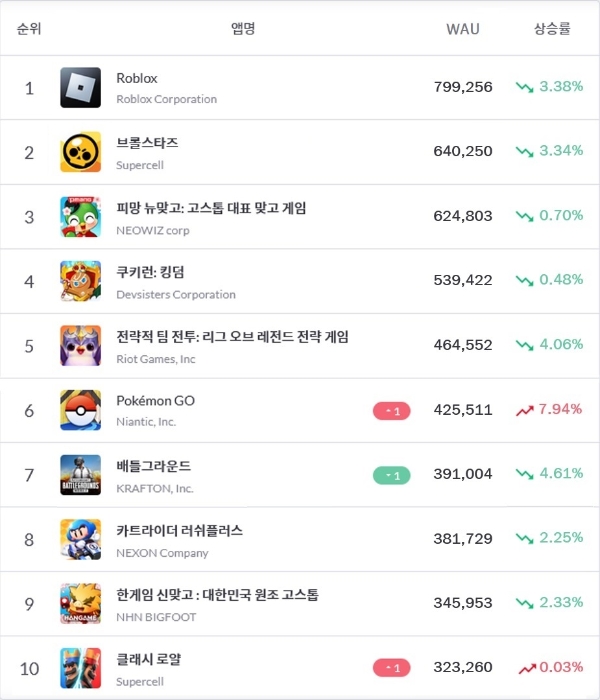 로블록스 코퍼레이션 '로블록스', 네오위즈 '피망 뉴맞고', 슈퍼셀 '브롤스타즈', 데브시스터즈 '쿠키런: 킹덤', 라이엇 게임즈 '전략적 팀 전투' 등은 한 주 동안 톱5의 자리를 그대로 지켰다.