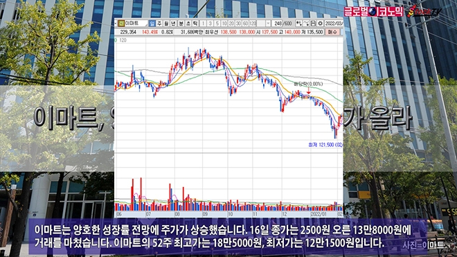 이마트는 양호한 성장률 전망에 주가가 상승했습니다. 16일 종가는 2500원 오른 13만8000원에 거래를 마쳤습니다. 이마트의 52주 최고가는 18만5000원, 최저가는 12만1500원입니다.