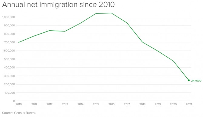 인구조사국의 최근 집계에 따르면 이민자 규모는 2020년 이후에도 하락세를 그치지 않아 2020년부터 지난해 사이에 들어온 이민자 규모는 24만7000명으로 더 쪼그라들었다. 2019년과 2020년 사이에 들어온 이민자 47만7000명의 거의 절반 수준이다.