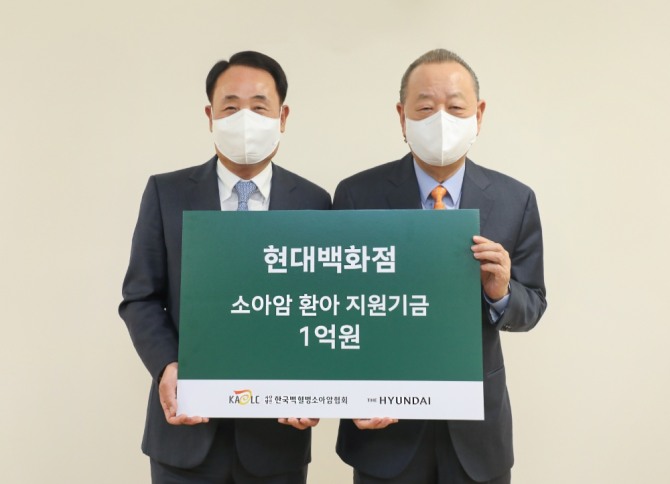 이미지 확대보기현대백화점은 27일 한국백혈병소아암협회에 소아암 환아 학습 활동 지원을 위한 지원금 1억원을 전달했다고 밝혔다. 이날 서울시 강남구 현대백화점 본사에서 열린 전달식에는 김형종 현대백화점 사장, 이중명 한국백혈병소아암협회 회장이 등이 참석했다.