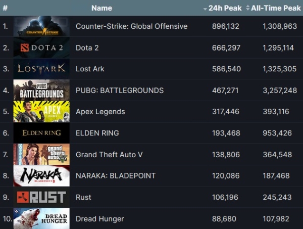 국산 게임 중 '로스트아크'와 크래프톤 '펍지: 배틀그라운드' 외에도 위메이드 '미르4'가 5만9218명으로 21위, 펄어비스 '검은 사막'이 2만203명으로 74위에 올랐다.