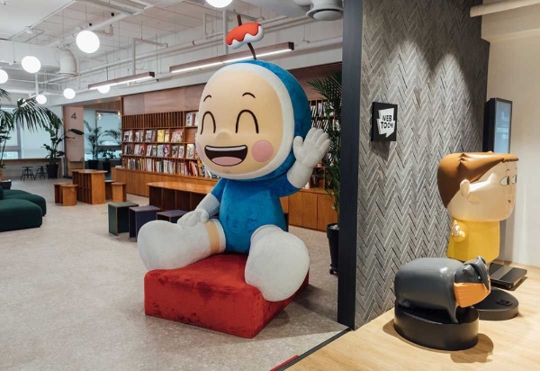네이버웹툰 사내 전경. '유미의 세포들'과 '마음의 소리' 등 웹툰 속 캐릭터들의 조형물들이 놓여있다. 사진=네이버웹툰