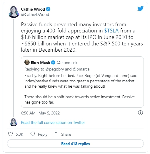 한국에서는 '돈나무 언니'라 불리는 캐시우드는 패시브 펀드(ETF)에 대해 "인덱스 펀드 때문에 투자자들은 테슬라의 주가가 400배 상승하기 전에 투자할 기회를 놓쳤다"고 말했다.
