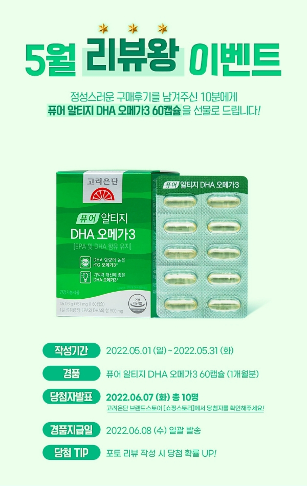 고려은단은 제품 리뷰 작성자 중 총 10명을 선정해 최근 TV CF로도 선보이고 있는 '퓨어 알티지 DHA 오메가3'를 선물로 증정한다. 당첨자는 다음 달 7일 공식몰의 '쇼핑스토리' 탭을 통해 공개할 예정이다.