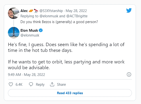 머스크는 앞서 이날 다른 트위터 사용자가 자신에게 ‘제프 베조스는 좋은 사람이라고 보느냐’고 묻자 이에 대한 답변으로 “나쁜 사람은 아니지만 요즘 목욕탕에서 주로 지내는 것 같다”며 이같이 주장했다.