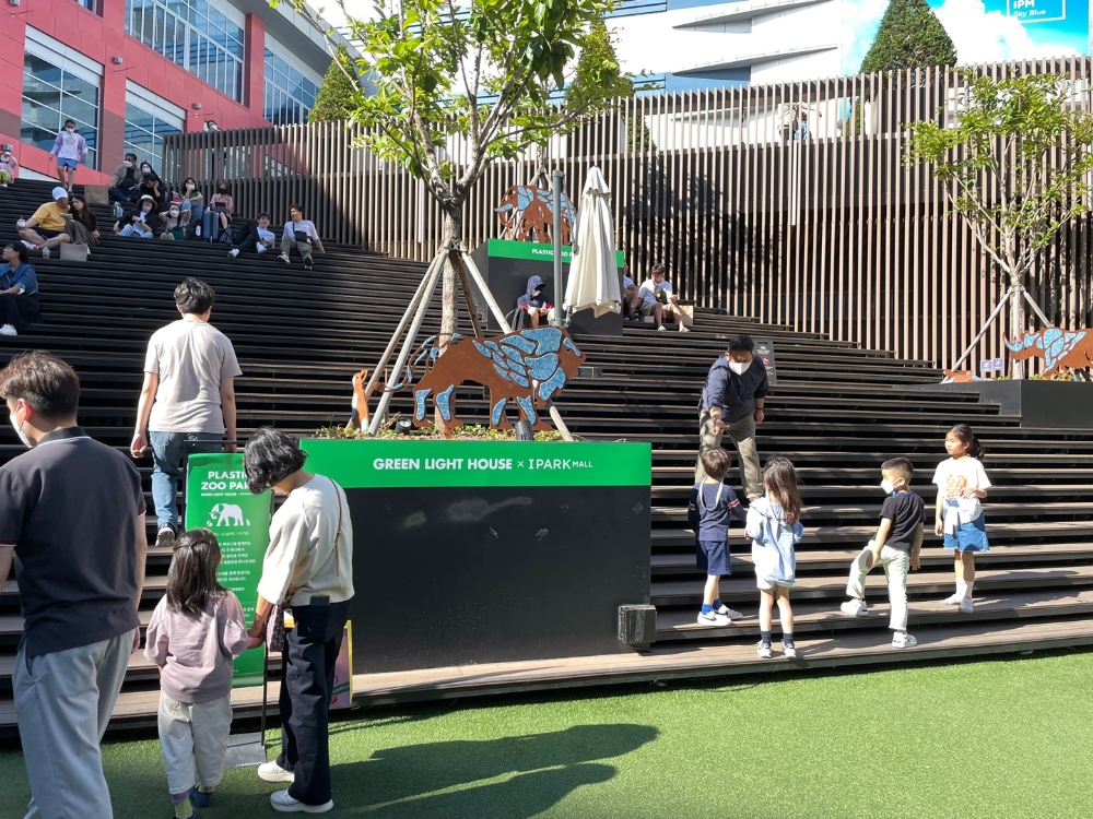 먼저, 버려지는 폐플라스틱이 예술 조형물로도 활용 될 수 있다는 점과 일상 속 작은 실천을 통해 친환경 활동이 가능하다는 메시지를 고객과 함께 공감할 수 있는 전시공간을 마련 했다. 지난 4월, 리사이클 아티스트 'ingoh (잉고)'와 함께 진행 했던 '그린 라이트 하우스' 캠페인에서 수집된 폐플라스틱을 활용해 재탄생한 사자, 코끼리, 펭귄 등 총 10여 개의 리사이클링 조형물을 오는 30일까지 더 가든에서 만나 볼 수 있다.