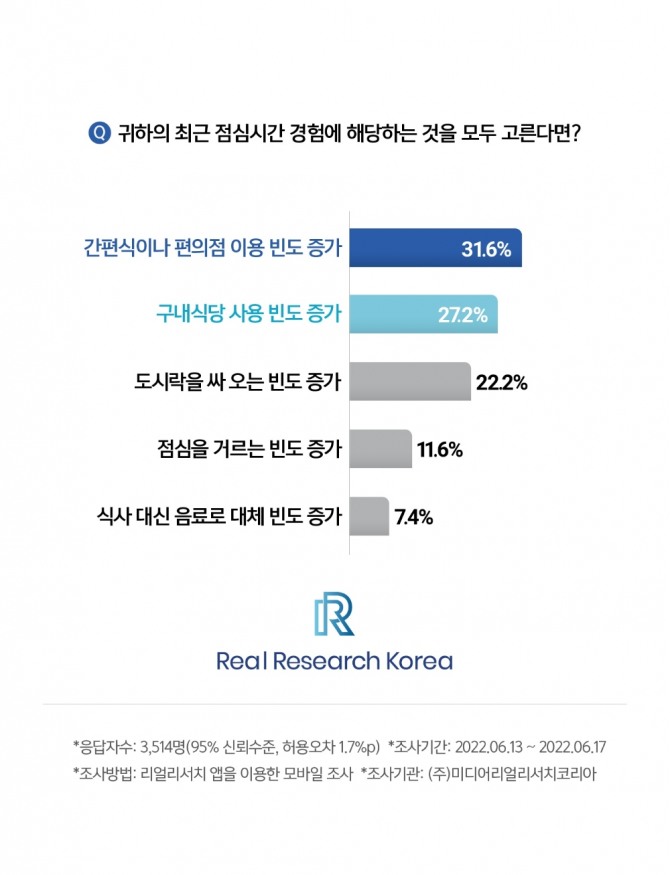 점심시간 식사 경험에 대해 묻는 질문에서 '간편식이나 편의점 이용 빈도가 증가했다'고 답한 응답자는 31.6%로 가장 높았다. 구내식당 사용 빈도 증가는 27.2%로 그 뒤를 이었다. 도시락을 싸오는 횟수가 늘었다는 비율도 22.2%로 높았다. 또 이 설문에 응답한 72.2%가 식사 비용이 많이 올랐다고 답했고 24.8%가 약간 올랐다고 답해 대부분이 물가 상승을 체감한 것으로 조사됐다.