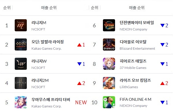 엔씨소프트(NC) '리니지M'이 1위 자리를 지킨 가운데 '리니지2M'은 20일을 기점으로 톱5에 복귀했다. 출시 1주년을 앞둔 카카오게임즈 '오딘: 발할라 라이징'이 23일 저녁을 기점으로 NC '리니지W'를 제치고 2위에 올랐다.