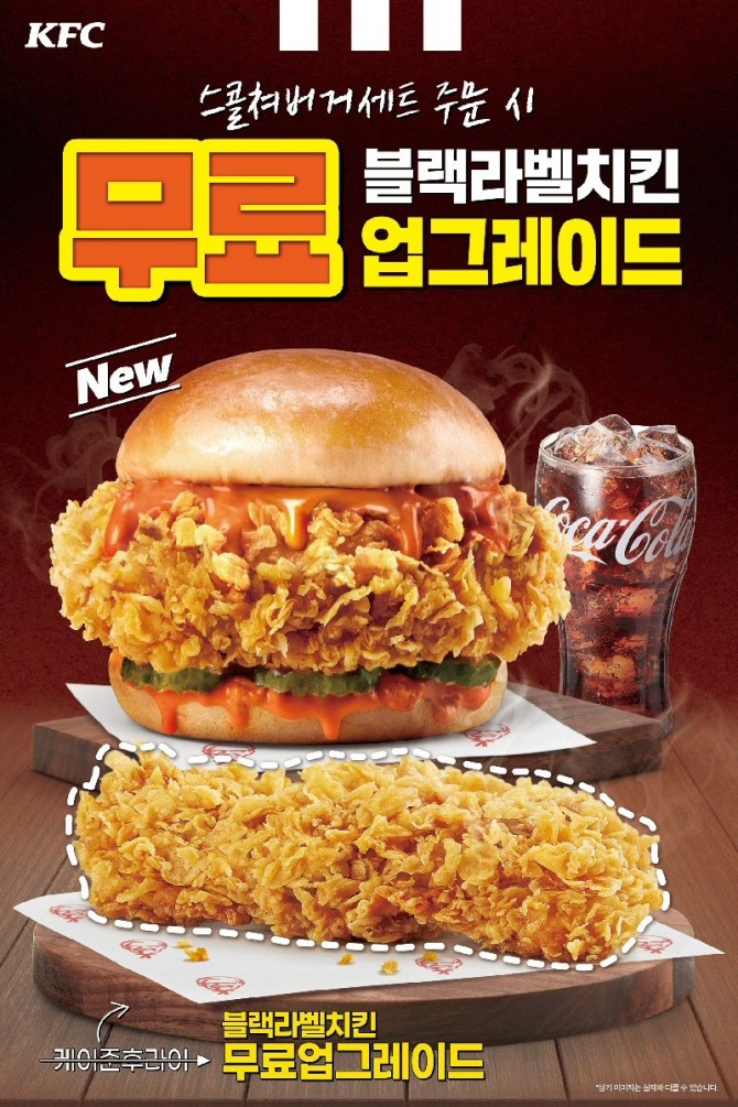 이번 프로모션으로 KFC는 스콜쳐버거 세트 구성에서 케이준후라이를 닭다리통살 블랙라벨치킨으로 무료 업그레이드해주는 행사다.