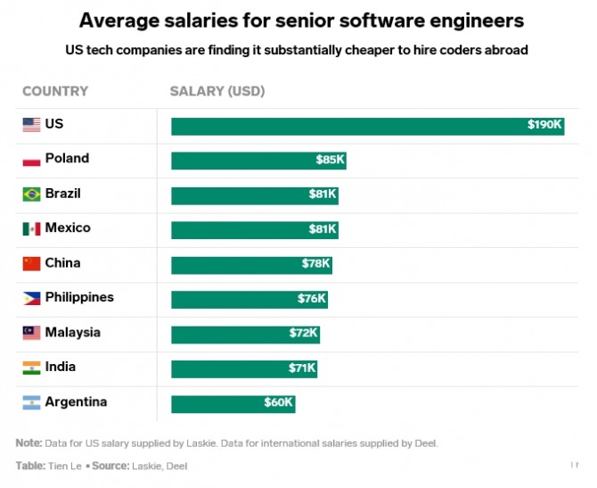 래스키가 조사한 결과에 따르면 미국 기업에서 일하는 미국인 간부급 소프트웨어엔지니어의 연봉은 평균 19만달러(약 2억4500만원) 정도로 파악됐으나 폴란드의 경우에는 8만5000달러(약 1억1000만원), 브라질은 8만1000달러(약 1억500만원), 중국은 7만8000달러(약 1억원), 필리핀은 7만6000달러(약 9800만원), 인도는 7만1000달러(약 9200만원) 등의 수준인 것으로 나타났다.