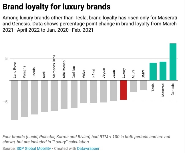 보고서에 따르면 제네시스, 이탈리아의 고급차 브랜드 마세라티, 테슬라 등 단 3개 브랜드만 제외하고 나머지 고급차 브랜드들은 죄다 브랜드 충성도가 하락한 것으로 나타났다.