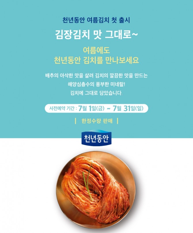 강원심층수 관계자는 "김장김치가 떨어져 가는 여름에도 해양심층수를 활용해 만든 프리미엄 천년동안 김치를 구매하고 싶다는 소비자들의 오랜 요청에 화답할 수 있어 기쁘다"며 "앞으로도 건강하고 맛있는 김치를 선보일 수 있도록 최선을 다하겠다"고 말했다.