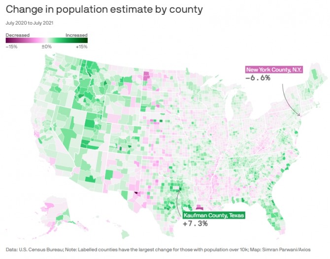 미 인구조사국이 펴낸 이번 분석 보고서에서 또한가지 주목할 대목은 코로나19 사태를 계기로 미국인의 삶의 근거지가 인구가 많은 동북부에서 상대적으로 인구가 적은 서부와 남부 지역으로 옮겨가고 있는 현상이 확인됐다는 것.