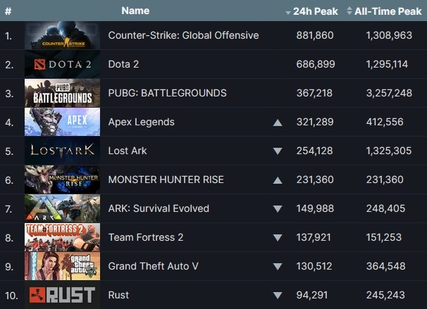 밸브 '카운터 스트라이크: 글로벌 오펜시브'와 '도타 2', 크래프톤 '펍지: 배틀그라운드' 등이 톱3를 지킨 가운데 스마일게이트가 개발, 아마존 게임즈가 서비스 중인 '로스트아크'가 전주 대비 동시 접속자 수가 9만4626명 감소해 EA '에이펙스 레전드'에 4위를 내줬다.