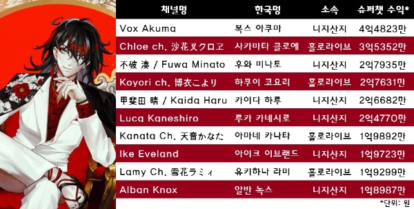 이미지 확대보기한국 버추얼 유튜버 중 가장 많은 수익을 거둔 것은 구 니지산지 한국 지부(니지산지KR) 소속 '민수하'로 1375만원의 수익을 기록했다. 버추얼 유튜버 걸그룹 '이세계 아이돌', 보이그룹 '레볼루션 하트' 스마일게이트의 '세아 스토리', 로나유니버스 '로나땅' 등은 트위치를 주 무대로 활동해 플레이보드 집계에서 제외됐다.