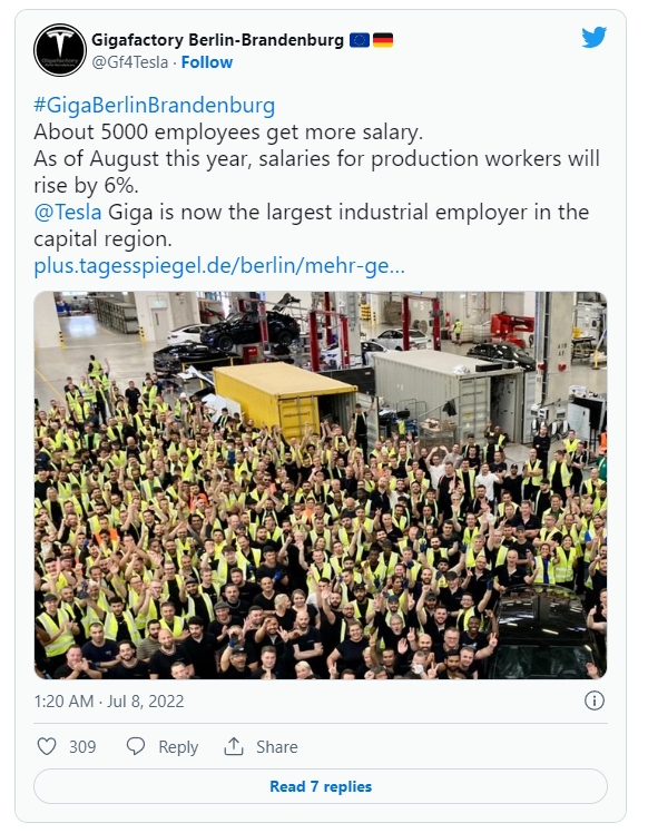 테슬라라티는 테슬라 독일법인이 8일 낸 발표문을 인용해 다음달부터 기가팩토리4에서 일하는 생산직 사원의 월급을 다음달부터 6% 인상한다고 보도했다.