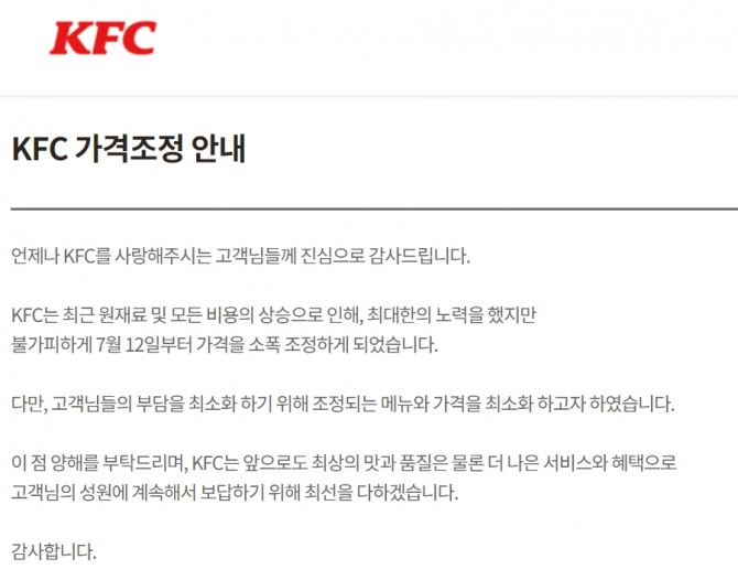 KFC는 "최근 원재료 및 모든 비용의 상승으로 불가피하게 가격을 소폭 조정하게 됐다"라며 "고객 부담을 최소화하고자 조정되는 메뉴와 가격을 최소화했다"고 말했다.