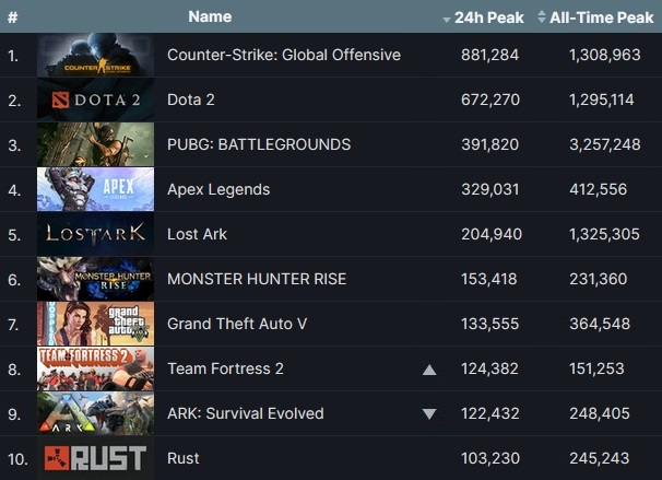 국산 게임 중 '펍지: 배틀그라운드'와 '로스트아크' 외에도 위메이드 '미르4'가 최다 동시 접속 4만3787명으로 29위, 펄어비스 '검은 사막'이 1만9070명으로 71위, 님블뉴런 '이터널 리턴'이 8116명으로 130위에 올랐다.