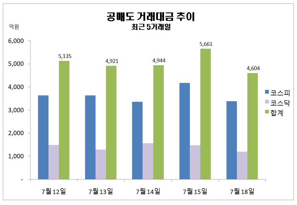 19일 한국거래소에 따르면 지난 18일 주식시장에서 공매도 거래대금 규모는 4604억원을 기록했다.