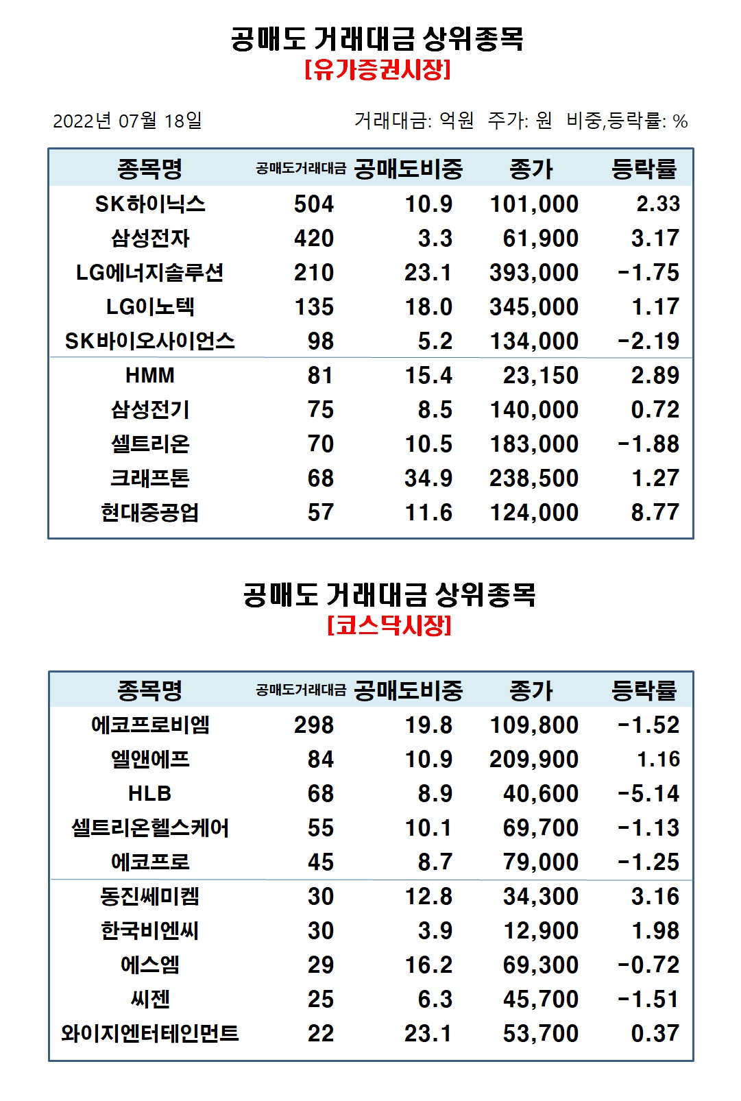 유가증권시장에서 공매도 거래대금 상위종목은 SK하이닉스 504억원, 삼성전자 420억원, LG에너지솔루션 210억원, LG이노텍 135억원, SK바이오사이언스 98억원, HMM 81억원, 삼성전기 75억원, 셀트리온 70억원, 크래프톤 68억원, 현대중공업 57억원 순으로 집계됐다.