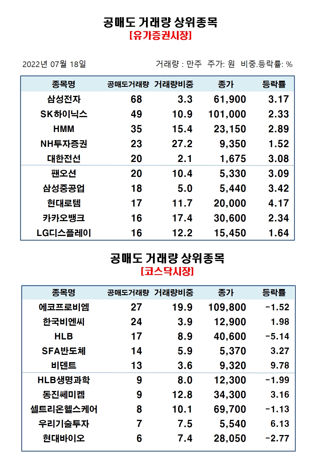 유가증권시장에서 공매도 거래량 상위종목은 삼성전자 68만주, SK하이닉스 49만주, HMM 35만주, NH투자증권 23만주, 대한전선 20만주, 팬오션 20만주, 삼성중공업 18만주, 현대로템 17만주, 카카오뱅크 16만주, LG디스플레이 16만주 순으로 집계됐다.