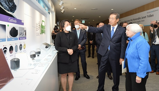재닛 옐런(Janet Yellen) 미국 재무부 장관이 방한 첫날인 19일 서울 강서구 마곡동 LG사이언스파크를 방문해 전기차 배터리 소재 공급망에 대한 한미 정부와 민간의 협력 강화를 강조했다.
