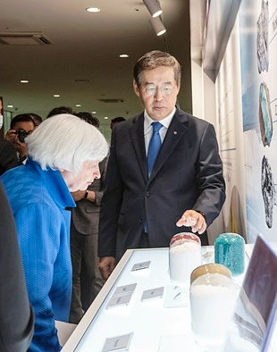 옐런 장관과 신학철 부회장은 LG화학의 전지 소재 기술과 지속가능 전략이 담긴 전시장을 함께 둘러보며 소재 공급망 구축에 대한 협력 방안을 논의했다. 사진=LG화학이미지 확대보기